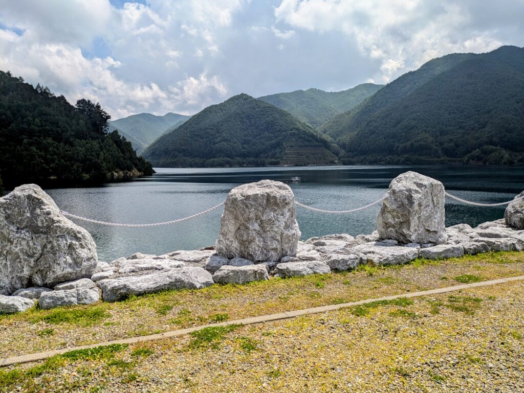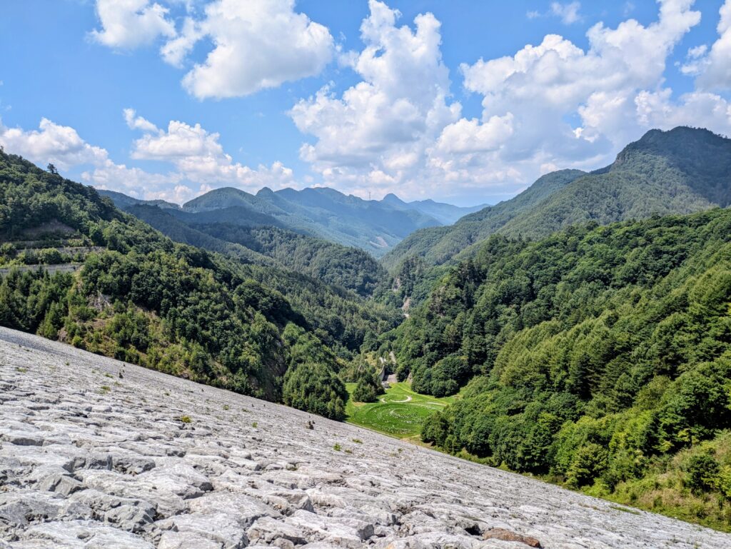 南相木村からは約7kmでダムに着くと書いてありました、沢沿いの道を延々と上っていきます、道がだんだんと細くなり運転には注意が必要です、対向車はまったくなく10分ほど運転をしてようやく到着しました、こんな山の中に広大な空間が見えました、見事に積み上げられた石垣が見事で、一般てきなダムの概念ではなく水を貯めて放流するタイプのダムではありません、本当こんな山の中に大規模なダムを建設されたとは驚きです、景色も最高です。